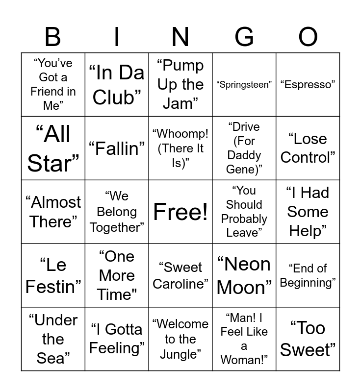 This bingo card has a free space and 74 words: “Let It Go”, “Hey Ya”, “Whoomp! (There It Is)”, “Mountain Music”, “Not Like Us”, “A Whole New World”, “Umbrella”, “I Like To Move It”, “Fancy”, “Good Luck, Babe!”, “Under the Sea”, “Crazy In Love”, “Drive (For Daddy Gene)”, “Espresso”, “Beauty and the Beast”, “I Gotta Feeling”, “Y.M.C.A.”, “You Should Probably Leave”, “Texas Hold ‘Em”, “You’ve Got a Friend in Me”, “We Belong Together”, “Pump Up the Jam”, “Springsteen”, “I Had Some Help”, “All Star”, “Crazy”, “We Will Rock You”, “Take Me Home, Country Roads”, “Birds of a Feather”, “Hakuna Matata”, “Fallin”, “Sandstorm”, “Mean”, “Million Dollar Baby”, “Everything is Awesome”, “Poker Face”, “Jump Around”, “Amarillo By Morning”, “Too Sweet”, “Happy”, “Lose Yourself”, “Sweet Caroline”, “I Walk the Line”, “We Can’t Be Friends”, “Can’t Stop the Feeling”, “In Da Club”, “All I Do Is Win”, “Jolene”, “Die With a Smile”, “Life is a Highway”, “Since U Been Gone”, “Seven Nation Army”, “Neon Moon”, “Saturn”, “We Don’t Talk About Bruno”, “Cry Me A River”, “Welcome to the Jungle”, “Friends in Low Places”, “Beautiful Things”, “Le Festin”, “One More Time", “Thunder-struck”, “Man! I Feel Like a Woman!”, “End of Beginning”, “Almost There”, “Milkshake”, “It Takes Two”, “Goodbye Earl”, “Lose Control”, “Hawaiian Rollercoaster Ride”, “Toxic”, “Enter Sandman”, “The Gambler” and “Stick Season”.