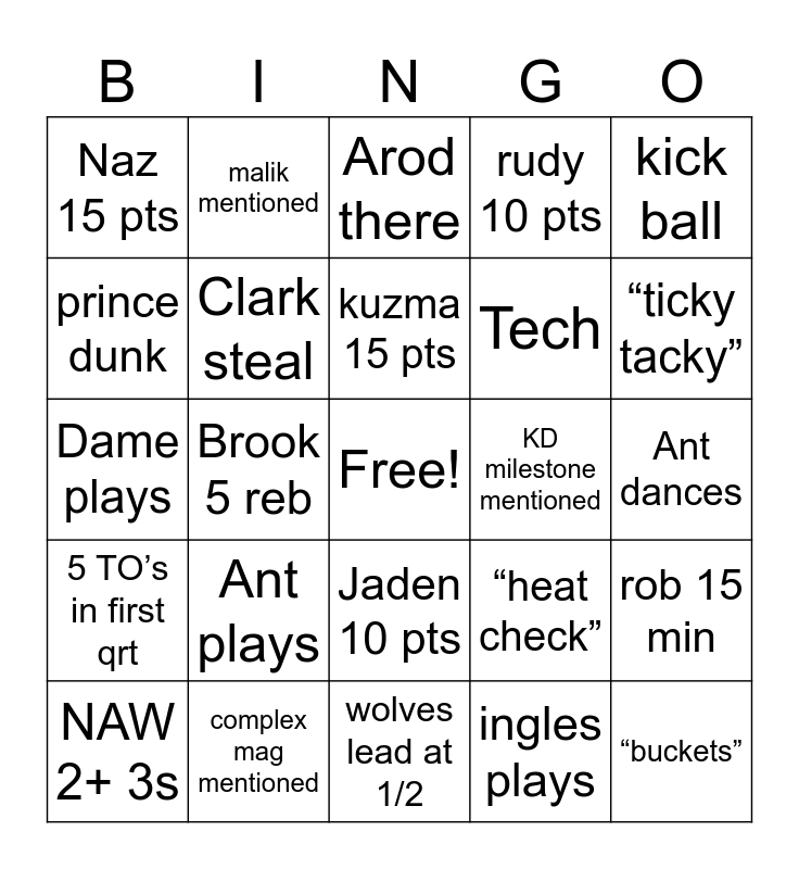 This bingo card has a free space and 24 words: Ant plays, complex mag mentioned, kuzma 15 pts, NAW 2+ 3s, kick ball, Naz 15 pts, prince dunk, malik mentioned, KD milestone mentioned, Jaden 10 pts, Tech, Dame plays, “heat check”, rob 15 min, Clark steal, ingles plays, Ant dances, Arod there, “ticky tacky”, Brook 5 reb, “buckets”, 5 TO’s in first qrt, rudy 10 pts and wolves lead at 1/2.