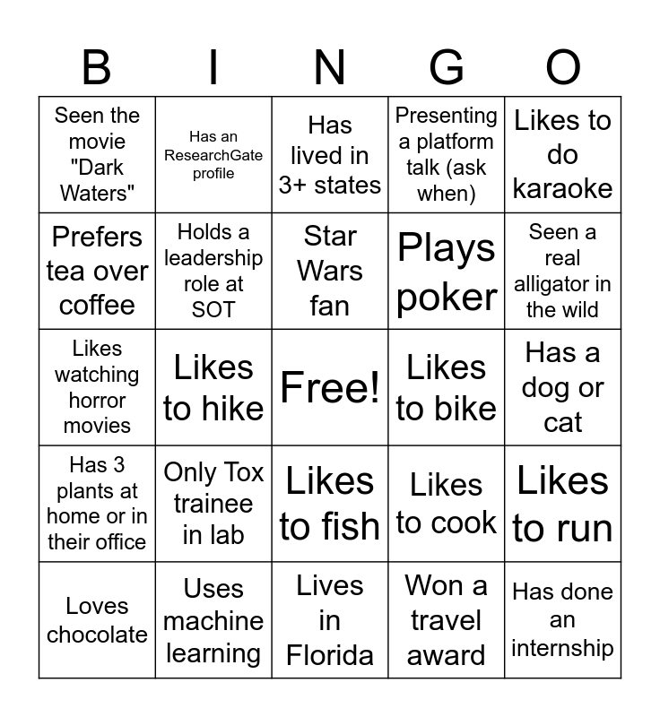 This bingo card has a free space and 95 words: Works with zebrafish, Works with rats or mice, Won a travel award, Wears glasses, Wearing fun socks!, Watches sports, Watched a Tox documentary this year, Uses machine learning, unusual route to grad school, Traveled this summer, Took a gap year, Studies persistent organic pollutants, Studies heavy metals, Star Wars fan, SOT newbie, Seen the movie "Dark Waters", Seen a real alligator in the wild, Same undergraduate major, Same school for undergrad and grad, Same favorite color, Same birth month, Read "Silent Spring", Published a paper in Toxicological Sciences, Presenting a poster, Presenting a platform talk (ask when), Prefers tea over coffee, Plays video games, Plays poker, Plays chess, Participated in a CE course, Only Tox trainee in lab, Mentors an undergrad student, Loves roller caosters, Loves genetics, Loves chocolate, Loves chemistry, Lives in Florida, Listens to podcasts (ask their favorite!), Likes watching horror movies, Likes to volunteer, Likes to run, Likes to hike, Likes to fish, Likes to do karaoke, Likes to cook, Likes to bike, Likes to bake, Likes pineapple on pizza, Likes board games, Knows martial arts, Knows a fun tox fact, Knows a coding language (R, python, etc.), Knows 2+ languages, Is left-handed, Is a TA, Is a swimmer, Is a postdoctoral fellow, Is a part of another Toxicology society, Is a night owl, Is a morning person, Holds a leadership role at SOT, Has visited Disneyland/ DisneyWorld, Has seen a movie in theaters this year, Has run a half or full marathon, Has ridden a motorcycle, Has read 5+ books this year, Has played Pokemon or Pokemon Go, Has met a celebrity, Has lived in 3+ states, Has experienced a major lab disaster, Has dyed their hair, Has done cell culture experiments, Has done an internship, Has broken a bone, Has binged a TV series, Has been skydiving, Has been in a band or orchestra, Has beaten an escape room, Has attended a conference abroad/internationally, Has an ResearchGate profile, Has an interesting hobby (ask them about it!), Has a tattoo, Has a reptile, Has a Master’s degree, Has a dog or cat, Has 3 plants at home or in their office, Grew up in the same state as you, Grew up in a different state/country than you, Drinks 2+ coffee/day, Does bioinformatic analysis, Completed lab rotations, Can sing the periodic table, Can play an instrument, Attended their last regional chapter meeting and Attended last year's AM in SLC.
