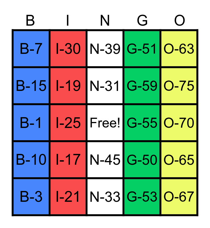 This bingo card has a free space and 39 words: B-5, I-20, N-35, G-50, O-65, B-10, I-25, N-40, G-55, O-70, B-15, I-30, G-60, O-75, B-1, I-17, N-45, G-51, O-61, B-3, I-19, N-31, G-53, O-63, B-5, I-21, N-33, G-57, O-73, B-7, I-23, N-37, G-59, O-67, B-9, I-27, N-39, G-47 and O-71.