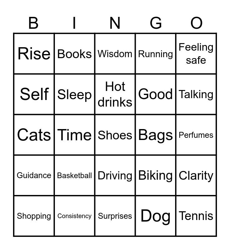 This bingo card has a free space and 24 words: Basketball, Consistency, Hot drinks, Shopping, Feeling safe, Rise, Self, Books, Bags, Driving, Good, Cats, Biking, Clarity, Sleep, Dog, Perfumes, Wisdom, Talking, Time, Tennis, Guidance, Running and Surprises.