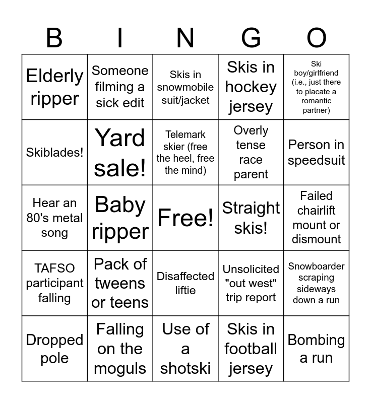 This bingo card has a free space and 33 words: Skis in Carhartts, Skis in jeans, Baby ripper, Open jacket, moving downhill, TAFSO participant falling, Yard sale!, Ski boy/girlfriend (i.e., just there to placate a romantic partner), Dropped pole, Someone filming a sick edit, Anyone in a headband, Telemark skier (free the heel, free the mind), Skis in snowmobile suit/jacket, Backcountry at the resort (in touring gear), Ski patrol response, Straight skis!, Person in speedsuit, Falling on the moguls, Hear an 80's metal song, Pack of tweens or teens, Unsolicited "out west" trip report, Disaffected liftie, Not skiing, but there for the vibes, Elderly ripper, Failed chairlift mount or dismount, Use of a shotski, Bombing a run, Skis in hockey jersey, Overly tense race parent, Skiblades!, Snowboarder scraping sideways down a run, Kid on a leash, Skis in football jersey and Any sort of Grateful Dead paraphernalia.