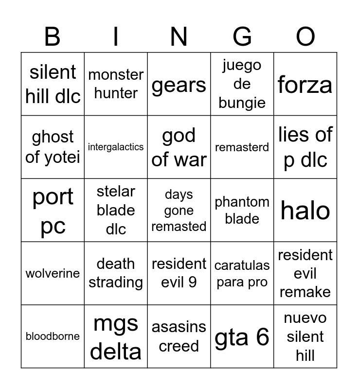 This bingo card has a free space and 24 words: death strading, mgs delta, god of war, bloodborne, forza, silent hill dlc, ghost of yotei, monster hunter, phantom blade, resident evil 9, remasterd, port pc, caratulas para pro, resident evil remake, intergalactics, gta 6, halo, gears, lies of p dlc, stelar blade dlc, nuevo silent hill, wolverine, juego de bungie and asasins creed.