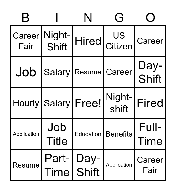 This bingo card has a free space and 36 words: Employment, Part-Time, Full-Time, Salary, Benefits, Application, Resume, Job, Career, Hourly, Salary, US Citizen, Education, Night-shift, Day-Shift, Career Fair, Job Title, Job Title, Career Fair, Hired, Fired, Full-Time, Part-Time, Resume, Day-Shift, Night-Shift, Hourly, Salary, Career, Job, Benefits, US Citizen, Application, Education, References and Insurance.