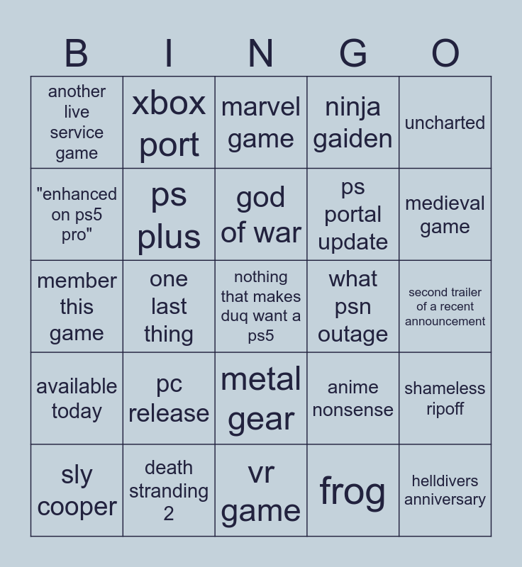 This bingo card has a free space and 24 words: pc release, death stranding 2, god of war, sly cooper, uncharted, another live service game, "enhanced on ps5 pro", xbox port, what psn outage, metal gear, ps portal update, member this game, anime nonsense, shameless ripoff, ps plus, frog, second trailer of a recent announcement, marvel game, medieval game, one last thing, helldivers anniversary, available today, ninja gaiden and vr game.