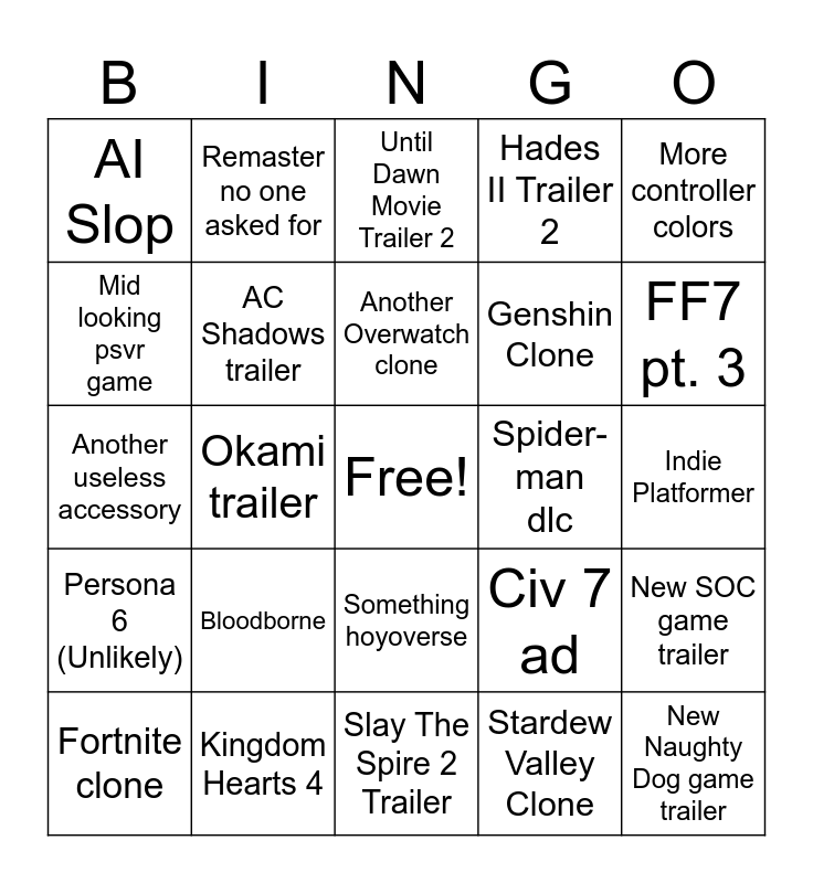 This bingo card has a free space and 24 words: Bloodborne, Kingdom Hearts 4, Another Overwatch clone, Fortnite clone, More controller colors, AI Slop, Mid looking psvr game, Remaster no one asked for, Spider-man dlc, Something hoyoverse, Genshin Clone, Another useless accessory, Civ 7 ad, New SOC game trailer, AC Shadows trailer, Stardew Valley Clone, Indie Platformer, Until Dawn Movie Trailer 2, FF7 pt. 3, Okami trailer, New Naughty Dog game trailer, Persona 6 (Unlikely), Hades II Trailer 2 and Slay The Spire 2 Trailer.