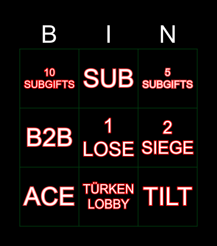 This bingo card has 9 words: ACE, 5 SUBGIFTS, SUB, B2B, 10 SUBGIFTS, 2 SIEGE, 1 LOSE, TILT and TÜRKEN LOBBY.
