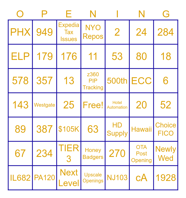 This bingo card has a free space and 48 words: 270, 80, Upscale Openings, Westgate, 13, 52, 949, PA120, 24, 63, 284, NYO Repos, ECC, 500th, 67, 20, ELP, 18, OTA Post Opening, 2, 53, 25, PHX, 179, Newly Wed, 176, 6, IL682, z360 PIP Tracking, 357, cA, Hotel Automation, Choice FICO, 234, 143, HD Supply, Hawaii, 578, $105K, TIER 3, 89, 1928, Expedia Tax Issues, Next Level, 11, Honey Badgers, 387 and NJ103.