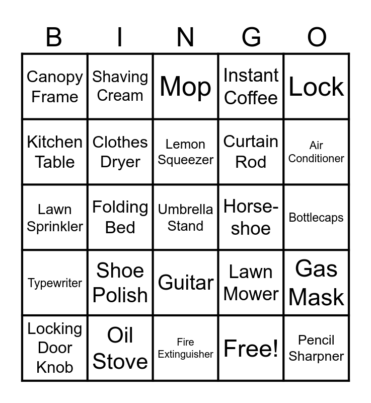 This bingo card has 30 words: Oil Stove, Biscuit Cutter, Folding Bed, Ironing Board, Canopy Frame, Mop, Clothes Dryer, Guitar, Horse-shoe, Fire Extinguisher, Bottlecaps, Umbrella Stand, Free!, Pencil Sharpner, Air Conditioner, Dustpan, Lawn Mower, Typewriter, Shoe Polish, Lock, Lawn Sprinkler, Comb, Shaving Cream, Curtain Rod, Kitchen Table, Instant Coffee, Gas Mask, Locking Door Knob, Lemon Squeezer and Ice Cream Scoop.