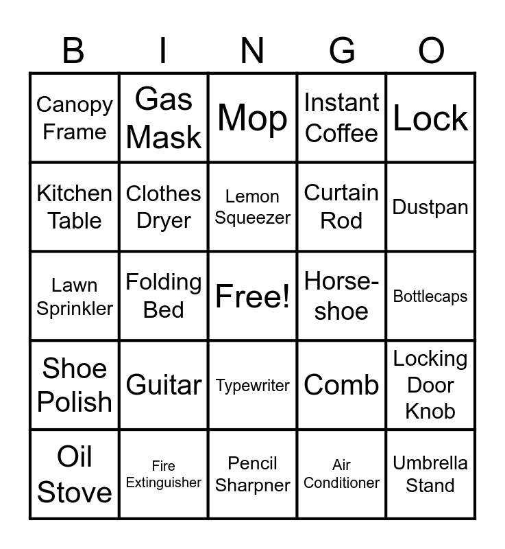 This bingo card has a free space and 29 words: Oil Stove, Biscuit Cutter, Folding Bed, Ironing Board, Canopy Frame, Mop, Clothes Dryer, Guitar, Horse-shoe, Fire Extinguisher, Bottlecaps, Umbrella Stand, Pencil Sharpner, Air Conditioner, Dustpan, Lawn Mower, Typewriter, Shoe Polish, Lock, Lawn Sprinkler, Comb, Shaving Cream, Curtain Rod, Kitchen Table, Instant Coffee, Gas Mask, Locking Door Knob, Lemon Squeezer and Ice Cream Scoop.