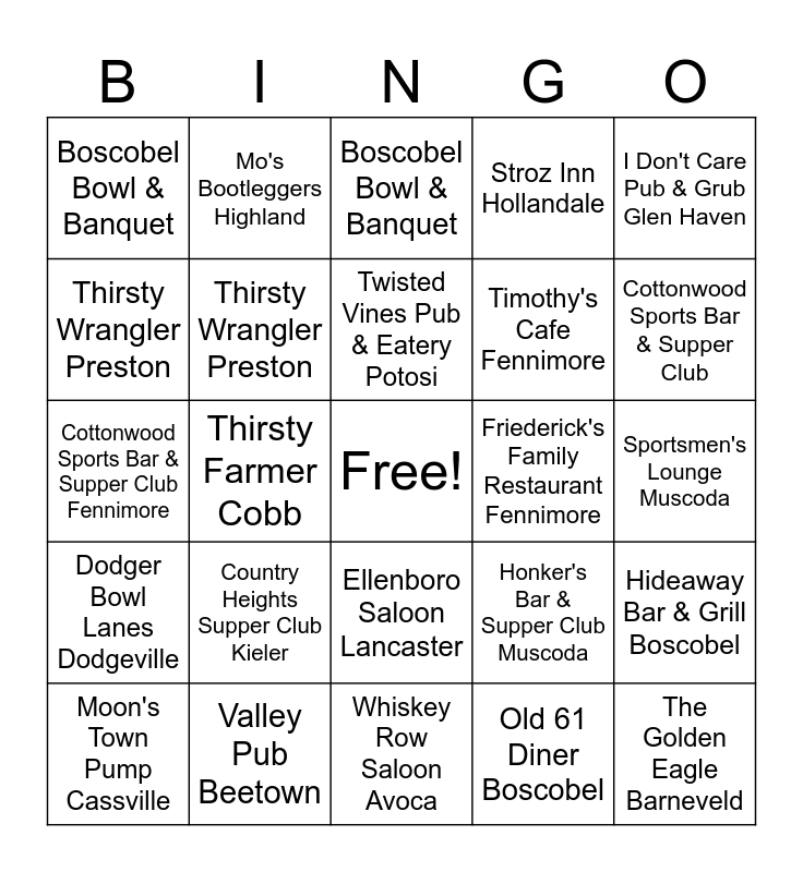 This bingo card has a free space and 24 words: Country Heights Supper Club Kieler, Valley Pub Beetown, Twisted Vines Pub & Eatery Potosi, Moon's Town Pump Cassville, I Don't Care Pub & Grub Glen Haven, Boscobel Bowl & Banquet, Thirsty Wrangler Preston, Mo's Bootleggers Highland, Friederick's Family Restaurant Fennimore, Ellenboro Saloon Lancaster, Timothy's Cafe Fennimore, Cottonwood Sports Bar & Supper Club Fennimore, Honker's Bar & Supper Club Muscoda, Hideaway Bar & Grill Boscobel, Thirsty Wrangler Preston, Old 61 Diner Boscobel, Sportsmen's Lounge Muscoda, Boscobel Bowl & Banquet, Cottonwood Sports Bar & Supper Club, Thirsty Farmer Cobb, The Golden Eagle Barneveld, Dodger Bowl Lanes Dodgeville, Stroz Inn Hollandale and Whiskey Row Saloon Avoca.