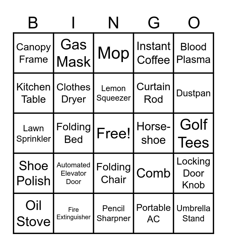 This bingo card has a free space and 29 words: Oil Stove, Biscuit Cutter, Folding Bed, Ironing Board, Canopy Frame, Mop, Clothes Dryer, Automated Elevator Door, Horse-shoe, Fire Extinguisher, Golf Tees, Umbrella Stand, Pencil Sharpner, Portable AC, Dustpan, Lawn Mower, Folding Chair, Shoe Polish, Blood Plasma, Lawn Sprinkler, Comb, Shaving Cream, Curtain Rod, Kitchen Table, Instant Coffee, Gas Mask, Locking Door Knob, Lemon Squeezer and Ice Cream Scoop.