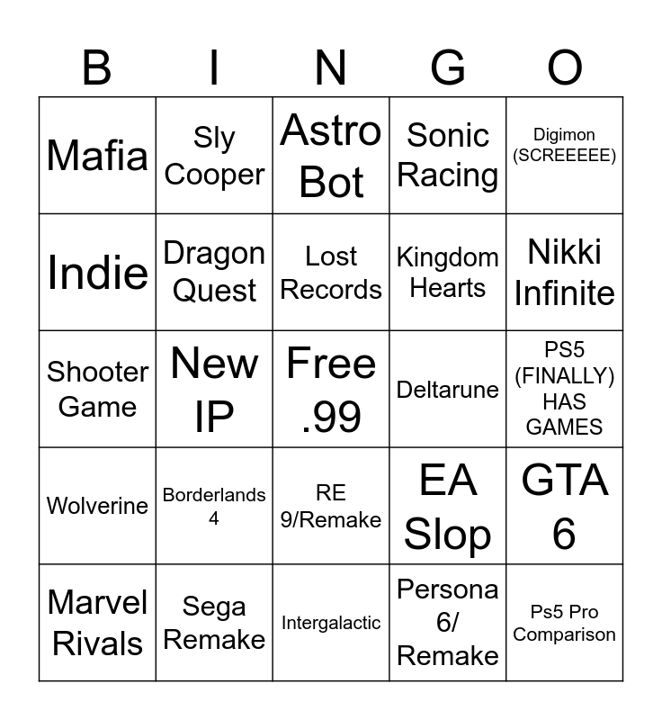 This bingo card has a free space and 24 words: Borderlands 4, Sega Remake, Lost Records, Marvel Rivals, Digimon (SCREEEEE), Mafia, Indie, Sly Cooper, Deltarune, RE 9/Remake, Kingdom Hearts, Shooter Game, EA Slop, GTA 6, Dragon Quest, Persona 6/ Remake, PS5 (FINALLY) HAS GAMES, Astro Bot, Nikki Infinite, New IP, Ps5 Pro Comparison, Wolverine, Sonic Racing and Intergalactic.