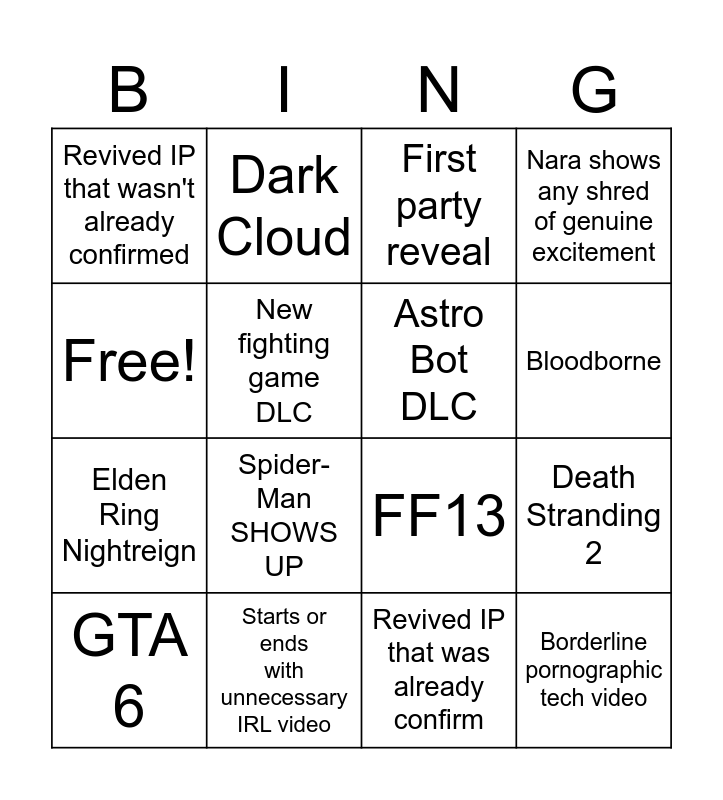 This bingo card has 16 words: Starts or ends with unnecessary IRL video, Death Stranding 2, First party reveal, Revived IP that wasn't already confirmed, Elden Ring Nightreign, Dark Cloud, FF13, Revived IP that was already confirm, Free!, New fighting game DLC, GTA 6, Nara shows any shred of genuine excitement, Spider-Man SHOWS UP, Bloodborne, Astro Bot DLC and Borderline pornographic tech video.