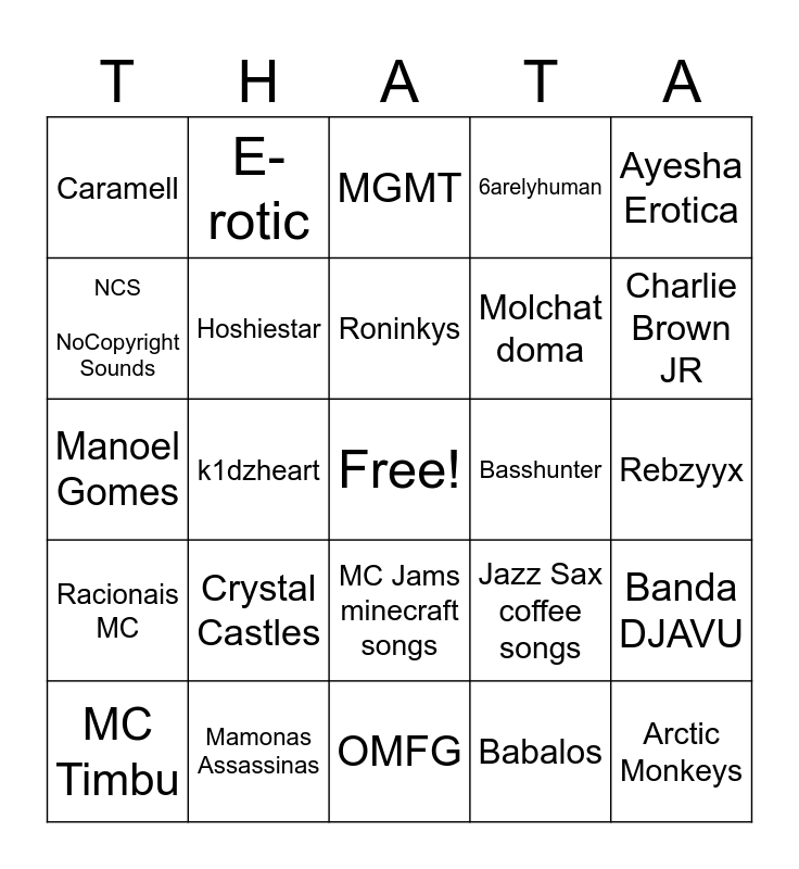 This bingo card has a free space and 24 words: Crystal Castles, Mamonas Assassinas, Roninkys, MC Timbu, Ayesha Erotica, Caramell, NCS NoCopyright Sounds, E-rotic, Basshunter, MC Jams minecraft songs, Molchat doma, Manoel Gomes, Jazz Sax coffee songs, Banda DJAVU, Hoshiestar, Babalos, Rebzyyx, MGMT, Charlie Brown JR, k1dzheart, Arctic Monkeys, Racionais MC, 6arelyhuman and OMFG.