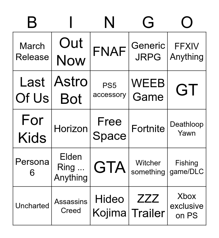 This bingo card has a free space and 24 words: Elden Ring ... Anything, Assassins Creed, PS5 accessory, Uncharted, FFXIV Anything, March Release, Last Of Us, Out Now, Fortnite, GTA, WEEB Game, For Kids, Witcher something, Fishing game/DLC, Astro Bot, ZZZ Trailer, Deathloop Yawn, FNAF, GT, Horizon, Xbox exclusive on PS, Persona 6, Generic JRPG and Hideo Kojima.
