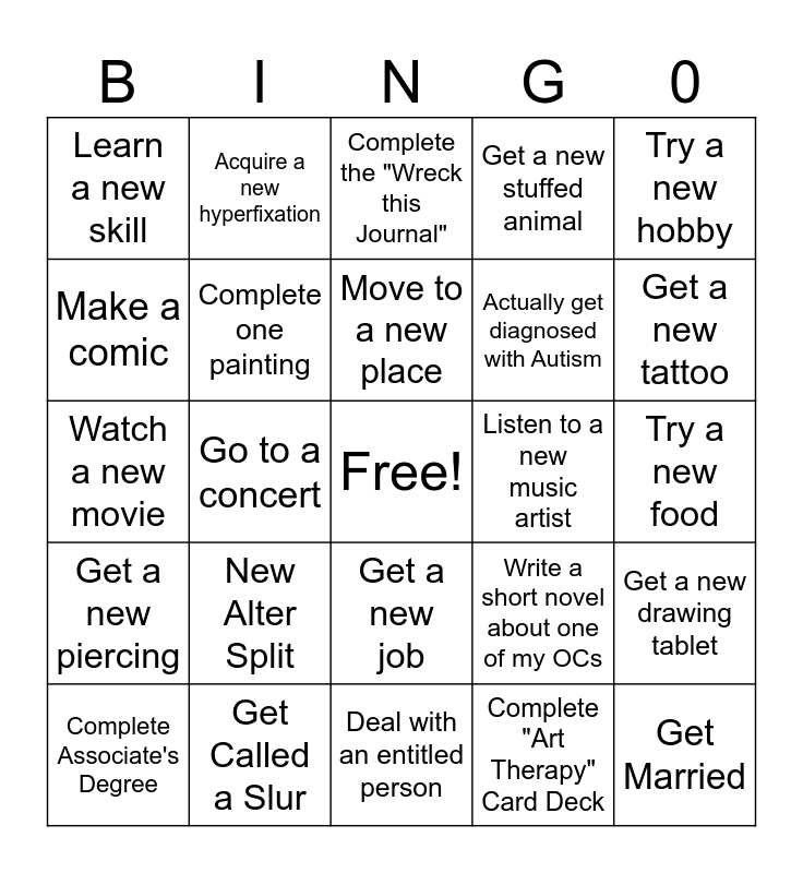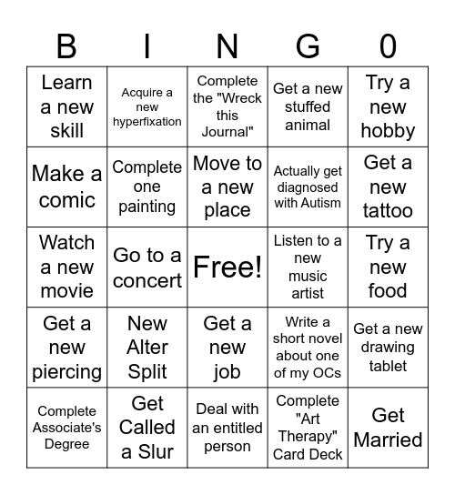 This bingo card has a free space and 24 words: New Alter Split, Get Called a Slur, Move to a new place, Complete Associate's Degree, Try a new hobby, Learn a new skill, Make a comic, Acquire a new hyperfixation, Listen to a new music artist, Get a new job, Actually get diagnosed with Autism, Watch a new movie, Write a short novel about one of my OCs, Get a new drawing tablet, Complete one painting, Complete "Art Therapy" Card Deck, Try a new food, Complete the "Wreck this Journal", Get a new tattoo, Go to a concert, Get Married, Get a new piercing, Get a new stuffed animal and Deal with an entitled person.