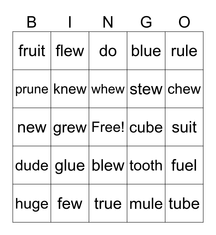 This bingo card has a free space and 29 words: huge, clue, grew, due, fruit, do, knew, glue, cube, few, suit, tube, true, mule, chew, food, blew, dude, rule, new, tooth, spoon, stew, prune, blue, flew, fuel, whew and hue.