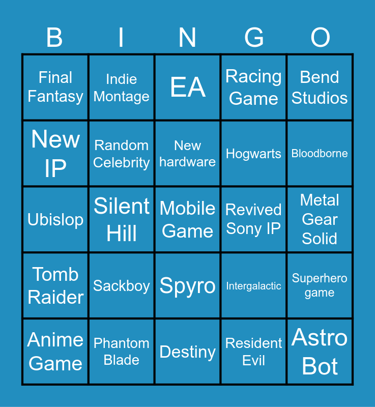 This bingo card has a free space and 46 words: Sonic, Astro Bot, Kingdom Hearts, Destiny, Sackboy, Battle Royale, Indie Montage, God of War Remasters, New IP, Kojima, Random Celebrity, Racing Game, Superhero game, Intergalactic, Sam Lake, Capcom - Not RE, New hardware, Revived Sony IP, Last of Us, Bend Studios, Silent Hill, Resident Evil, Final Fantasy, Hogwarts, Live Service, Bloodborne, Anime Game, Ghost of Yotai, Spyro, Tomb Raider, Santa Monica Studios, GTA VI, Star Wars, Rocksteady, Days Gone, Phantom Blade, Metal Gear Solid, Space Game, Silksong, Marathon, Xbox Game comes to PS, EA, Ubislop, DLC, Simulator Game and Wolverine.