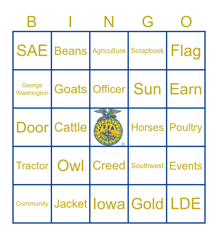 This bingo card has a free space and 30 words: Jacket, Blue, Cattle, Fair, SAE, Agriculture, Goats, Creed, Horses, Iowa, Poultry, LDE, Gold, Learn, Earn, National, Southwest, Tractor, Owl, Flag, Door, Corn, Beans, Sun, George Washington, Scrapbook, Events, Community, Officer and Tally Whacker.