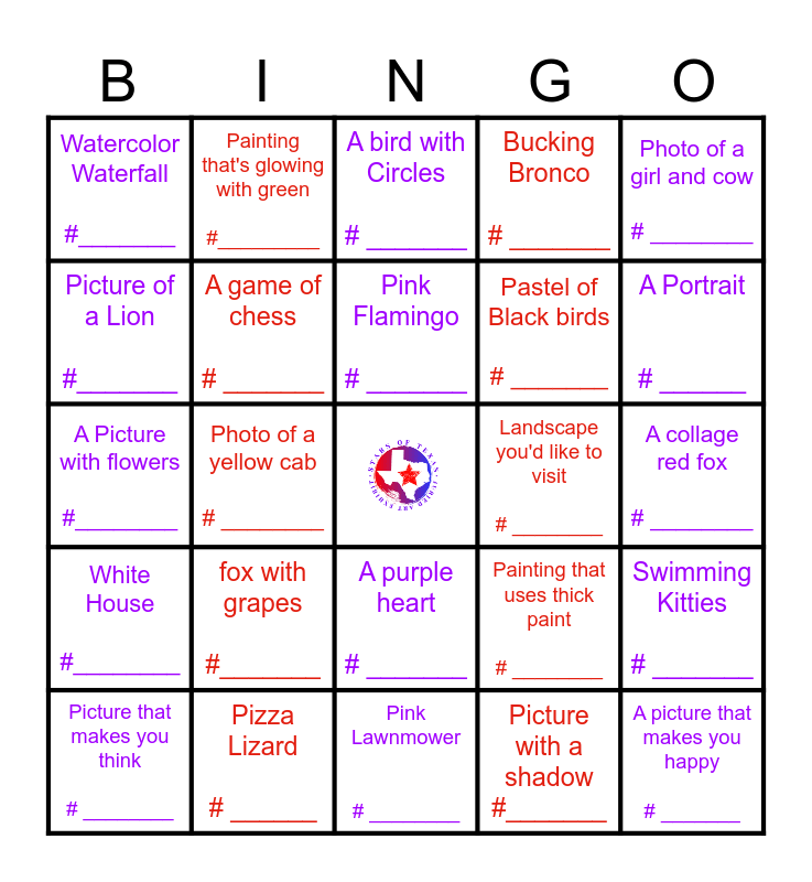 This bingo card has a free space and 24 words: Picture that makes you think # ________, fox with grapes #_______, Pink Flamingo # _______, Picture with a shadow #_______, Photo of a girl and cow # ________, Watercolor Waterfall #_______, Painting that's glowing with green #_________, A bird with Circles # _______, Landscape you'd like to visit # ________, A collage red fox # ________, A Picture with flowers #________, A game of chess # _______, Painting that uses thick paint # ________, Swimming Kitties # _______, Picture of a Lion #_______, Pizza Lizard # ______, Pink Lawnmower # ________, Bucking Bronco # _______, A Portrait # ______, White House #________, Photo of a yellow cab # ________, A purple heart # _______, Pastel of Black birds # _______ and A picture that makes you happy # _______.