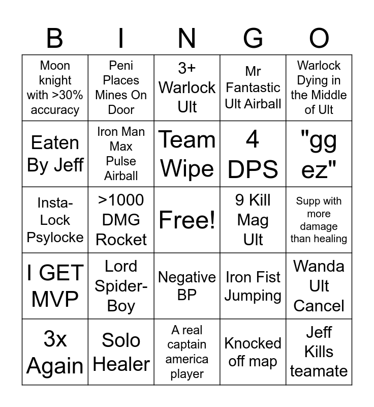 This bingo card has a free space and 24 words: Lord Spider-Boy, Solo Healer, Team Wipe, 3x Again, Warlock Dying in the Middle of Ult, Moon knight with >30% accuracy, Eaten By Jeff, Peni Places Mines On Door, 9 Kill Mag Ult, Negative BP, 4 DPS, Insta-Lock Psylocke, Iron Fist Jumping, Wanda Ult Cancel, Iron Man Max Pulse Airball, Knocked off map, Supp with more damage than healing, 3+ Warlock Ult, "gg ez", >1000 DMG Rocket, Jeff Kills teamate, I GET MVP, Mr Fantastic Ult Airball and A real captain america player.