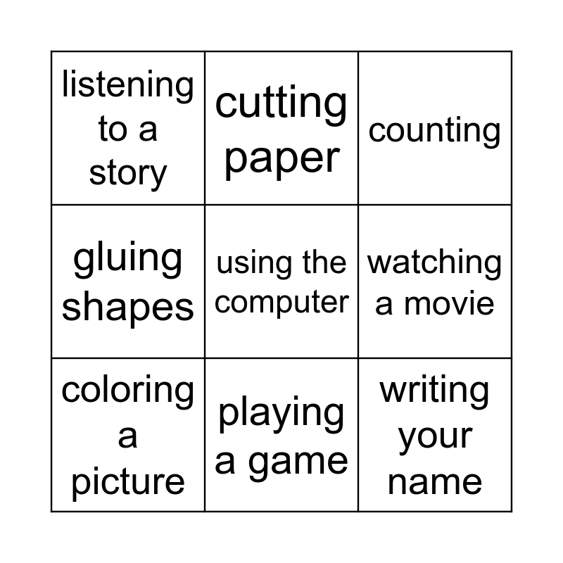 This bingo card has 9 words: coloring a picture, counting, cutting paper, gluing shapes, listening to a story, watching a movie, using the computer, writing your name and playing a game.
