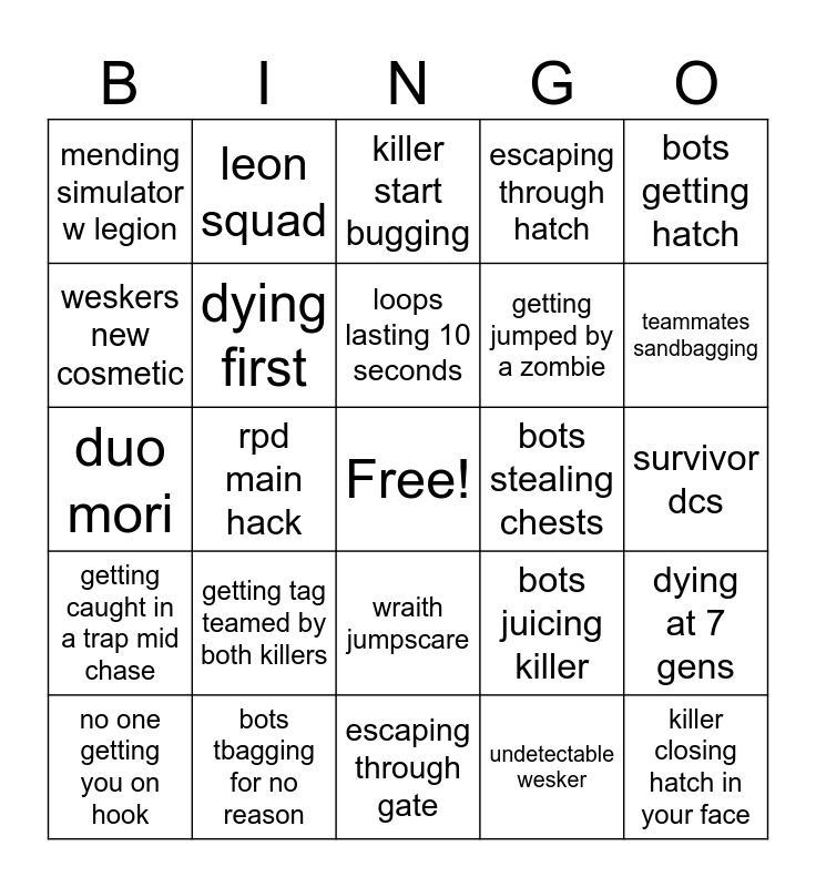 This bingo card has a free space and 24 words: getting tag teamed by both killers, bots tbagging for no reason, loops lasting 10 seconds, no one getting you on hook, bots getting hatch, mending simulator w legion, weskers new cosmetic, leon squad, bots stealing chests, wraith jumpscare, getting jumped by a zombie, duo mori, bots juicing killer, dying at 7 gens, dying first, undetectable wesker, survivor dcs, killer start bugging, teammates sandbagging, rpd main hack, killer closing hatch in your face, getting caught in a trap mid chase, escaping through hatch and escaping through gate.