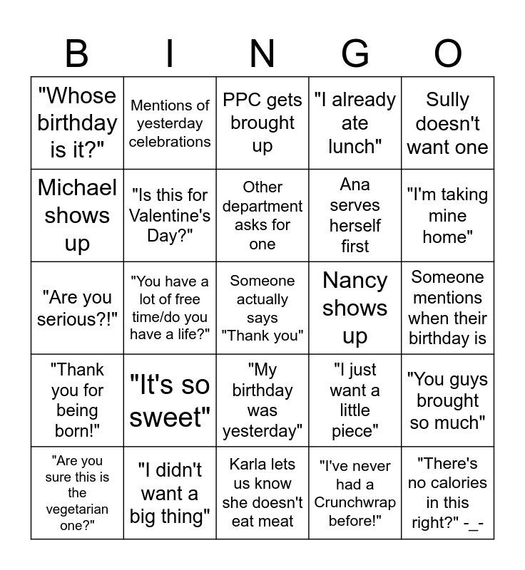This bingo card has a free space and 24 words: "It's so sweet", "I didn't want a big thing", Other department asks for one, "Are you sure this is the vegetarian one?", Sully doesn't want one, "Whose birthday is it?", Michael shows up, Mentions of yesterday celebrations, Nancy shows up, "My birthday was yesterday", Ana serves herself first, "Are you serious?!", "I just want a little piece", "You guys brought so much", "Is this for Valentine's Day?", "I've never had a Crunchwrap before!", Someone mentions when their birthday is, PPC gets brought up, "I'm taking mine home", "You have a lot of free time/do you have a life?", "There's no calories in this right?" -_-, "Thank you for being born!", "I already ate lunch" and Karla lets us know she doesn't eat meat.