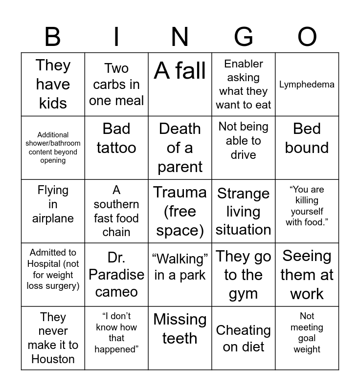 This bingo card has a free space and 49 words: Little dog, Not meeting goal weight, Dr. Now Yells, Missing teeth, Dr. Paradise cameo, Paper/styrofoam plate at home, Two carbs in one meal, They make it to Houston, Additional shower/bathroom content beyond opening, They’re married, Bad tattoo, Enabler asking what they want to eat, Seeing them at work, They go to the gym, Riding a scooter, FaceTiming in the grocery, Death of a parent, Strange living situation, An engagement, Lymphedema, A southern fast food chain, Cheating on diet, They have kids, Not being able to drive, Meeting the weight goal, Bed bound, They never make it to Houston, Being able to drive, “Walking” in a park, Admitted to Hospital (not for weight loss surgery), Improper footwear, Dr. Now comments on hygiene, Skype call with Dr. Now, Weight gain, “I don’t know how that happened”, “That’s not good.”, “How y’all doing?”, A physical therapist is mistreated, “You are killing yourself with food.”, New clothes shopping, Drive through on the way to Dr. Now, Car trouble, Moving during show, Getting surgery, Flying in airplane, A fall, Homemade contraption to help with something, Baby powder and Quitting Dr. Now’s program.