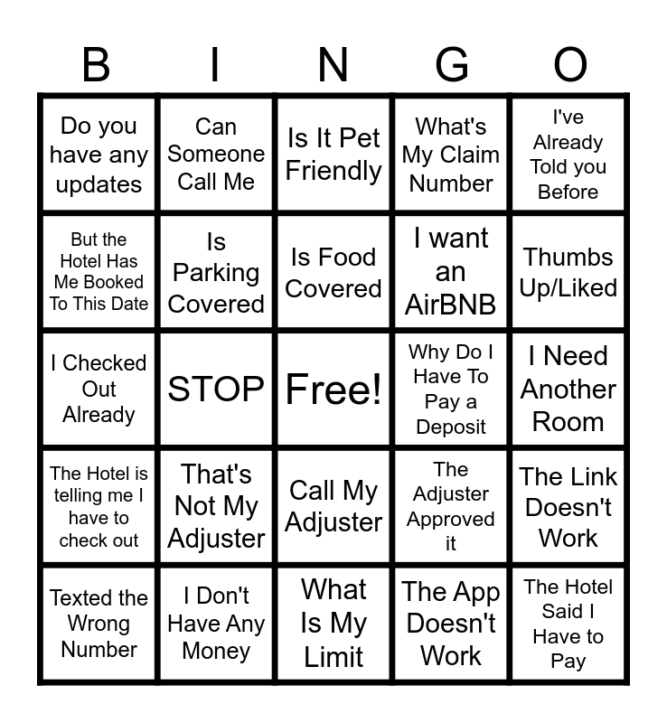 This bingo card has a free space and 33 words: Work is Not Done, I Don't Know, Call My Adjuster, Call my Contracor, Thumbs Up/Liked, Do you have any updates, STOP, START, What's My Claim Number, This Hotel Has Bugs, But the Hotel Has Me Booked To This Date, Can Someone Call Me, Holding for 30 Minutes now, The App Doesn't Work, I've Already Told you Before, I Checked Out Already, That's Not My Adjuster, What Is My Limit, The Adjuster Approved it, I Need Another Room, Texted the Wrong Number, Do you Cover Laundry, Is It Pet Friendly, Why Do I Have To Pay a Deposit, The Hotel Said I Have to Pay, The Hotel is telling me I have to check out, Is Parking Covered, Is Food Covered, I want an AirBNB, The Link Doesn't Work, These Options Won't Work, I Don't Have Any Money and What is my limit.