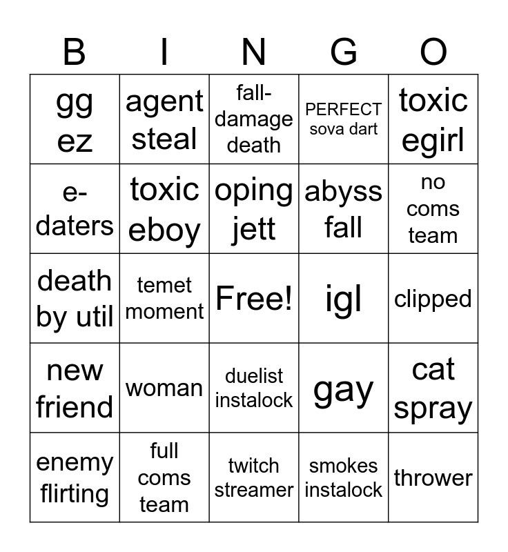 This bingo card has a free space and 24 words: woman, full coms team, oping jett, enemy flirting, toxic egirl, gg ez, e-daters, agent steal, igl, duelist instalock, abyss fall, death by util, gay, cat spray, toxic eboy, smokes instalock, clipped, fall-damage death, no coms team, temet moment, thrower, new friend, PERFECT sova dart and twitch streamer.