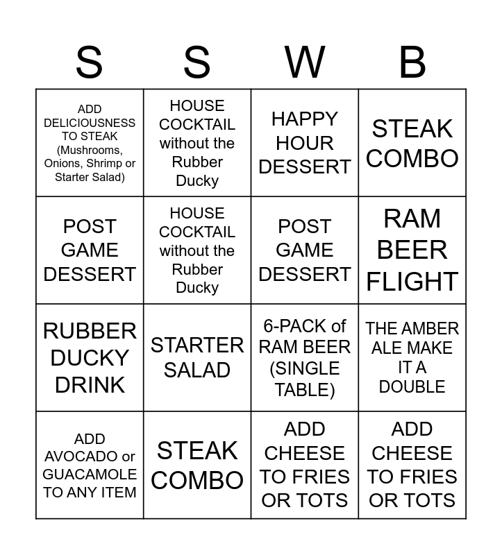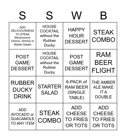 This bingo card has 16 words: STEAK COMBO, THE AMBER ALE MAKE IT A DOUBLE, HAPPY HOUR DESSERT, ADD DELICIOUSNESS TO STEAK (Mushrooms, Onions, Shrimp or Starter Salad), RUBBER DUCKY DRINK, HOUSE COCKTAIL without the Rubber Ducky, 6-PACK of RAM BEER (SINGLE TABLE), ADD CHEESE TO FRIES OR TOTS, POST GAME DESSERT, HOUSE COCKTAIL without the Rubber Ducky, ADD AVOCADO or GUACAMOLE TO ANY ITEM, STEAK COMBO, STARTER SALAD, RAM BEER FLIGHT, POST GAME DESSERT and ADD CHEESE TO FRIES OR TOTS.