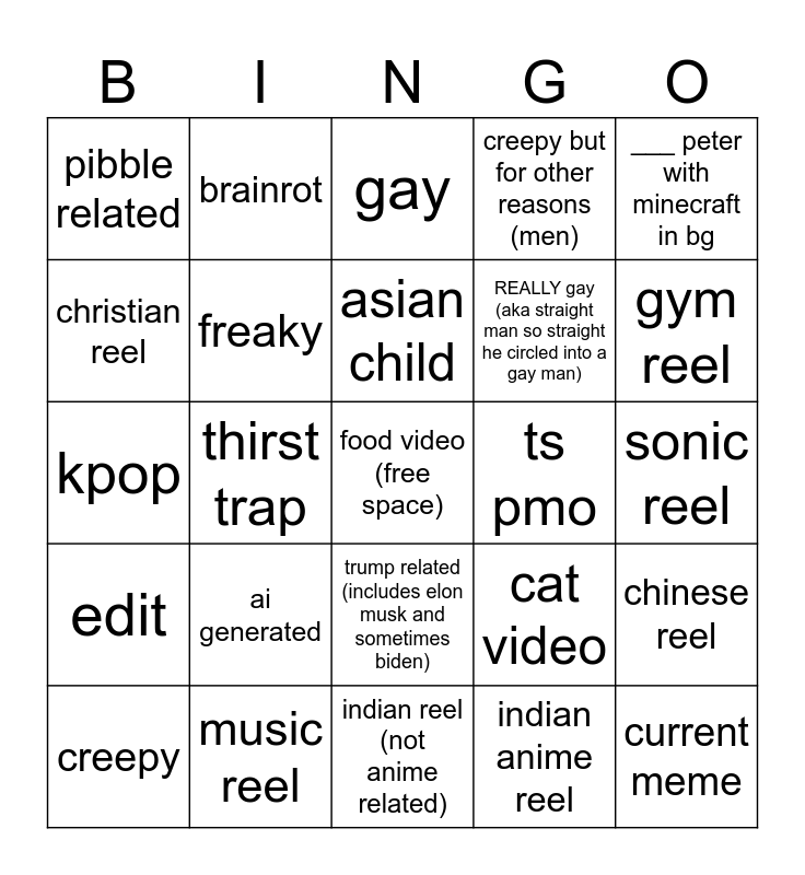 This bingo card has a free space and 24 words: ai generated, music reel, asian child, creepy, ___ peter with minecraft in bg, pibble related, christian reel, brainrot, ts pmo, trump related (includes elon musk and sometimes biden), REALLY gay (aka straight man so straight he circled into a gay man), kpop, cat video, chinese reel, freaky, indian anime reel, sonic reel, gay, gym reel, thirst trap, current meme, edit, creepy but for other reasons (men) and indian reel (not anime related).