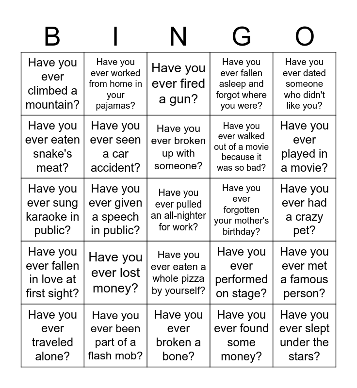 This bingo card has 25 words: Have you ever lost money?, Have you ever broken a bone?, Have you ever broken up with someone?, Have you ever traveled alone?, Have you ever dated someone who didn't like you?, Have you ever climbed a mountain?, Have you ever eaten snake's meat?, Have you ever worked from home in your pajamas?, Have you ever forgotten your mother's birthday?, Have you ever eaten a whole pizza by yourself?, Have you ever walked out of a movie because it was so bad?, Have you ever sung karaoke in public?, Have you ever performed on stage?, Have you ever met a famous person?, Have you ever seen a car accident?, Have you ever slept under the stars?, Have you ever had a crazy pet?, Have you ever fired a gun?, Have you ever played in a movie?, Have you ever given a speech in public?, Have you ever pulled an all-nighter for work?, Have you ever been part of a flash mob?, Have you ever fallen in love at first sight?, Have you ever fallen asleep and forgot where you were? and Have you ever found some money?.