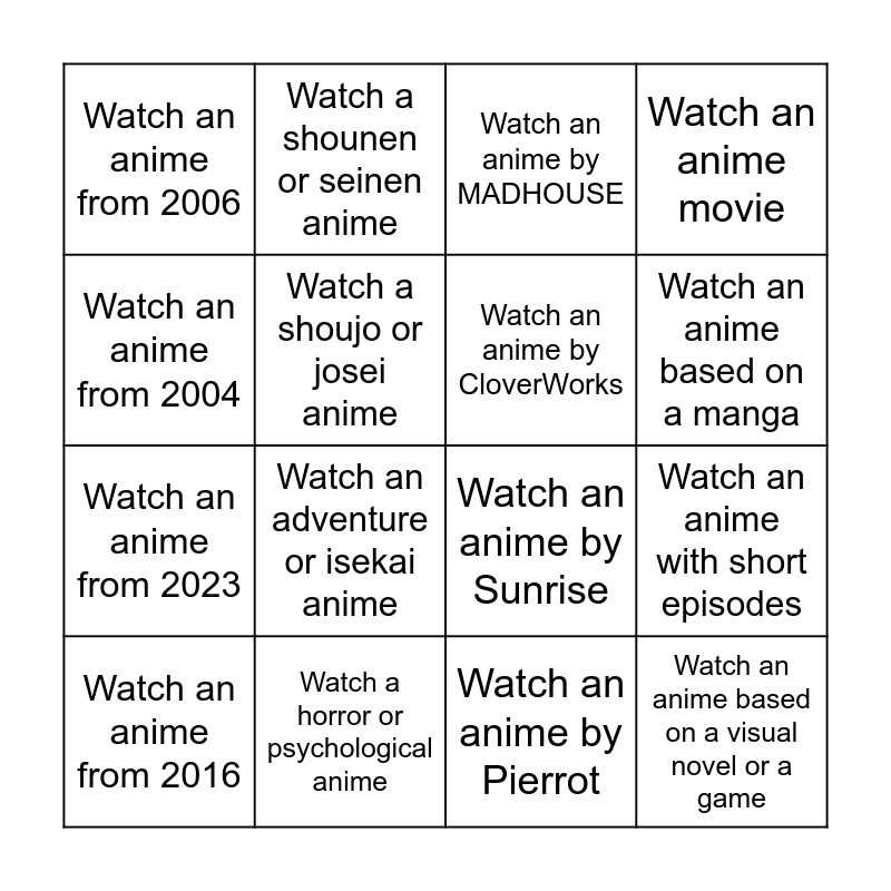 This bingo card has 16 words: Watch an anime from 2016, Watch a horror or psychological anime, Watch an anime by MADHOUSE, Watch an anime movie, Watch an anime from 2004, Watch a shounen or seinen anime, Watch an anime by Sunrise, Watch an anime with short episodes, Watch an anime from 2006, Watch a shoujo or josei anime, Watch an anime by Pierrot, Watch an anime based on a manga, Watch an anime from 2023, Watch an adventure or isekai anime, Watch an anime by CloverWorks and Watch an anime based on a visual novel or a game.