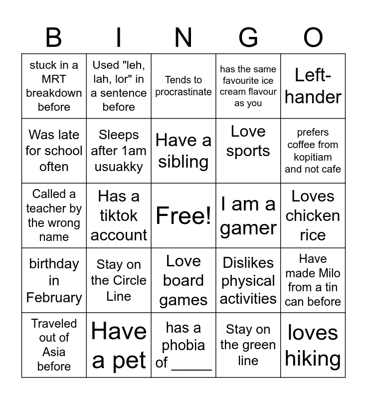 This bingo card has a free space and 24 words: Stay on the Circle Line, Have a pet, Have a sibling, Traveled out of Asia before, Left-hander, stuck in a MRT breakdown before, Was late for school often, Used "leh, lah, lor" in a sentence before, I am a gamer, Love board games, Love sports, Called a teacher by the wrong name, Dislikes physical activities, Have made Milo from a tin can before, Sleeps after 1am usuakky, Stay on the green line, Loves chicken rice, Tends to procrastinate, prefers coffee from kopitiam and not cafe, Has a tiktok account, loves hiking, birthday in February, has the same favourite ice cream flavour as you and has a phobia of _____.