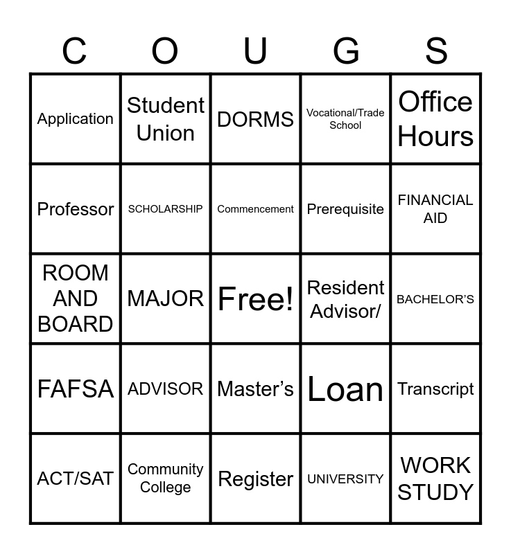 This bingo card has a free space and 29 words: ACT/SAT, GPA, MAJOR, Minor, Application, DORMS, SCHOLARSHIP, ADVISOR, Resident Advisor/, Community College, BACHELOR’S, WORK STUDY, Register, UNIVERSITY, FINANCIAL AID, Grant, Master’s, FAFSA, Office Hours, ROOM AND BOARD, Loan, Tutor, Prerequisite, Professor, Vocational/Trade School, Student Union, Transcript, Commencement and PhD.