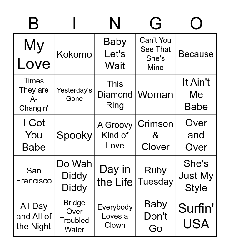 This bingo card has 45 words: 59th Street Bridge Song, A Groovy Kind of Love, A Summer Song, All Day and All of the Night, All I Really Want to Do, Baby Don't Go, Baby Let's Wait, The Beat Goes On, Because, Bridge Over Troubled Water, Can't You See That She's Mine, Crimson & Clover, Day in the Life, Do Wah Diddy Diddy, Don't Let the Sun Catch You Crying, Everybody Loves a Clown, Gloria, I Got You Babe, I Know a Place, It Ain't Me Babe, Kokomo, Long Cool Woman, Mony Mony, My Love, Now That I've Found You, Over and Over, Pleasant Valley Sunday, Rhinestone Cowboy, Ruby Tuesday, San Francisco, Scarborough Fair, She's Just My Style, Someday We'll Be Together, Son of a Preacher Man, Sounds of Silence, Spooky, Sugar Town, Sunny Afternoon, Surfin' USA, This Diamond Ring, Times They are A-Changin', Woman, World Without Love, Yesterday's Gone and You Don't Have to Say You Love Me.