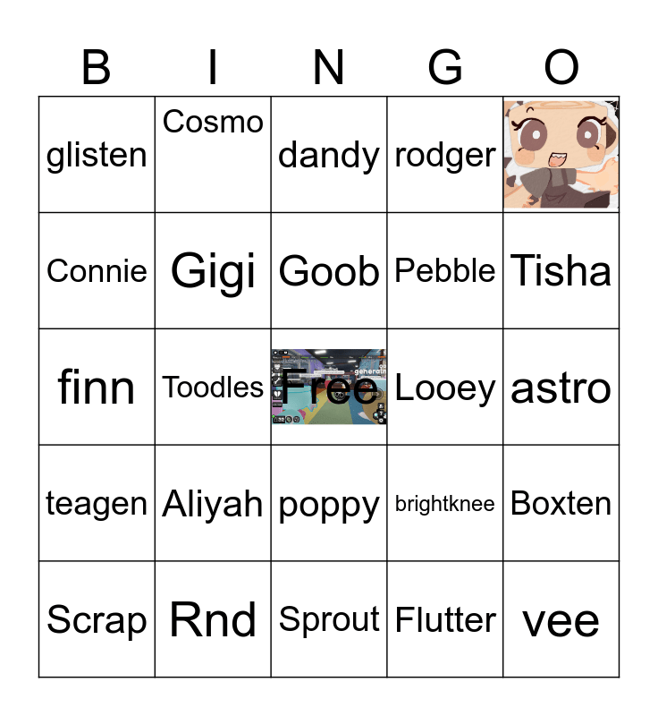 This bingo card has 1 images, a free space and 23 words: Aliyah, Rnd, Goob, Scrap, glisten, Connie, Cosmo, Looey, poppy, Pebble, finn, brightknee, Boxten, Gigi, Flutter, astro, dandy, Tisha, Toodles, vee, teagen, rodger and Sprout.