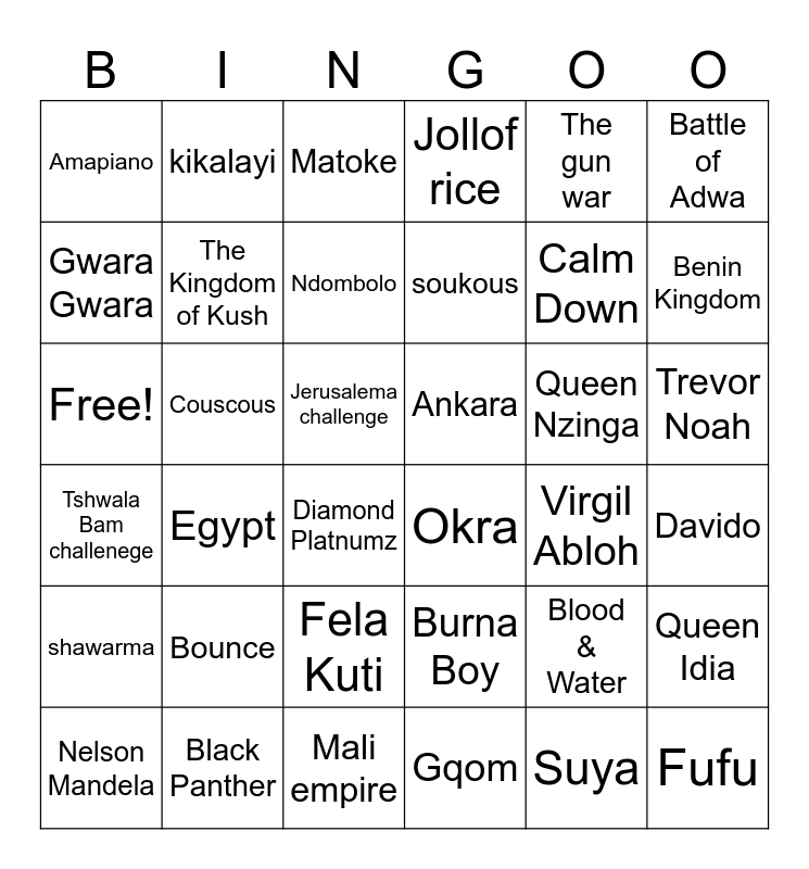 This bingo card has 36 words: Burna Boy, Fela Kuti, Gqom, Gwara Gwara, Tshwala Bam challenege, Ankara, The Kingdom of Kush, Mali empire, The gun war, Blood & Water, Benin Kingdom, Jollof rice, Queen Idia, Couscous, soukous, Amapiano, shawarma, Queen Nzinga, Free!, Matoke, Jerusalema challenge, Egypt, Okra, Diamond Platnumz, Virgil Abloh, kikalayi, Calm Down, Black Panther, Ndombolo, Battle of Adwa, Fufu, Nelson Mandela, Davido, Trevor Noah, Bounce and Suya.