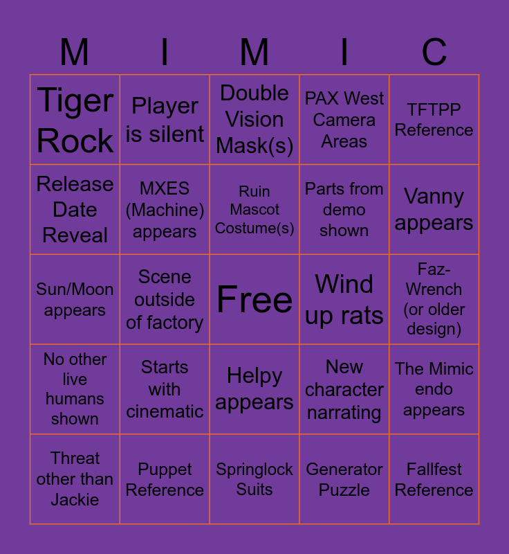 This bingo card has a free space and 24 words: Starts with cinematic, Puppet Reference, Ruin Mascot Costume(s), Threat other than Jackie, TFTPP Reference, Tiger Rock, Release Date Reveal, Player is silent, Wind up rats, Helpy appears, Parts from demo shown, Sun/Moon appears, New character narrating, The Mimic endo appears, MXES (Machine) appears, Generator Puzzle, Faz-Wrench (or older design), Double Vision Mask(s), Vanny appears, Scene outside of factory, Fallfest Reference, No other live humans shown, PAX West Camera Areas and Springlock Suits.