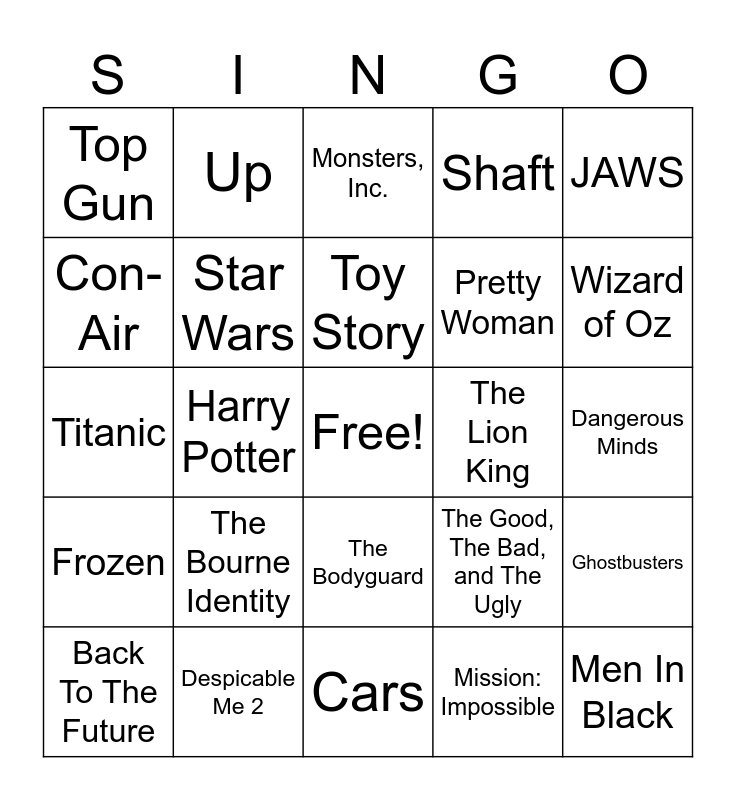 This bingo card has a free space and 32 words: Mission: Impossible, Pirates of the Caribbean, Harry Potter, Rocky, Frozen, Star Wars, JAWS, Ghostbusters, Up, The Incredibles, Toy Story, Monsters, Inc., Indiana Jones, Shrek, The Lion King, James Bond, Back To The Future, Titanic, The Bodyguard, The Bourne Identity, The Good, The Bad, and The Ugly, Jurassic Park, Dangerous Minds, Despicable Me 2, Men In Black, Shaft, Pretty Woman, Con-Air, Top Gun, Cars, Armageddon and Wizard of Oz.