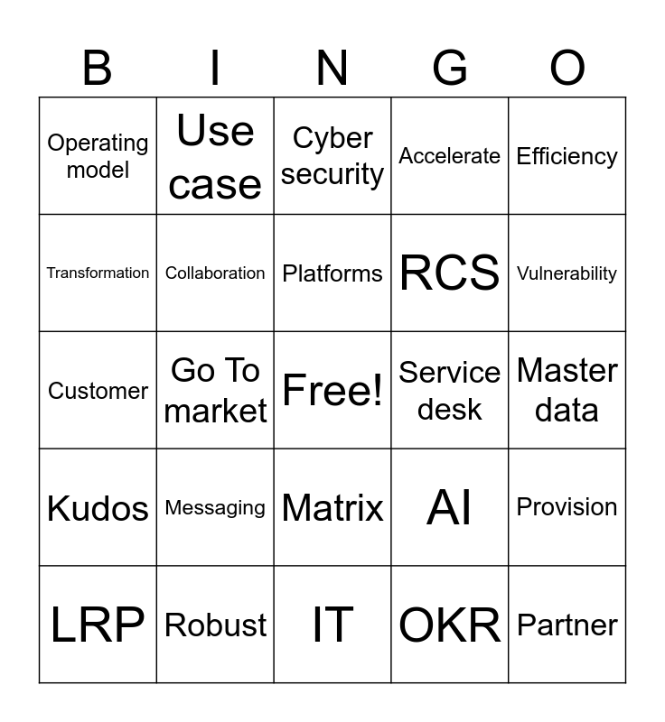 This bingo card has a free space and 24 words: Messaging, Robust, Platforms, LRP, Efficiency, Operating model, Transformation, Use case, Service desk, Matrix, RCS, Customer, AI, Provision, Collaboration, OKR, Master data, Cyber security, Vulnerability, Go To market, Partner, Kudos, Accelerate and IT.