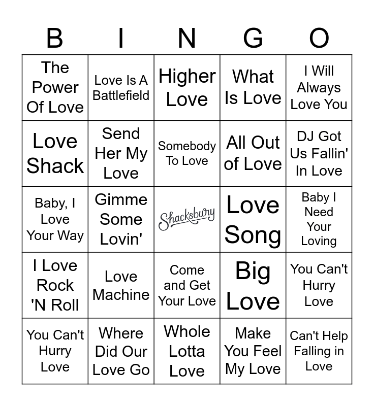 This bingo card has a free space and 47 words: Crazy Little Thing Called Love, Can't Help Falling in Love, Can You Feel The Love Tonight, Whole Lotta Love, Love Machine, You Give Love A Bad Name, Love Is A Battlefield, Love To Love You Baby, Love Shack, Love Me Two Times, Send Her My Love, What Is Love, You Can't Hurry Love, Big Love, One Love, The One I Love, Somebody To Love, Love Song, Who Loves You, I Will Always Love You, Gimme Some Lovin', Make You Feel My Love, The Power Of Love, All Out of Love, I Like It, I Love It, DJ Got Us Fallin' In Love, You Can't Hurry Love, This Love, Come and Get Your Love, I Love Rock 'N Roll, Part-Time Lover, Addicted To Love, I Just Called To Say I Love You, Stop! In The Name Of Love, The Things We Do For Love, Where Did Our Love Go, Baby I Need Your Loving, Best of My Love, Higher Love, We Found Love, Your Love, Higher Love, Baby, I Love Your Way, I'd Do Anything For Love, I Love It, Can't Buy Me Love and Can't Get Enough Of Your Love, Babe.