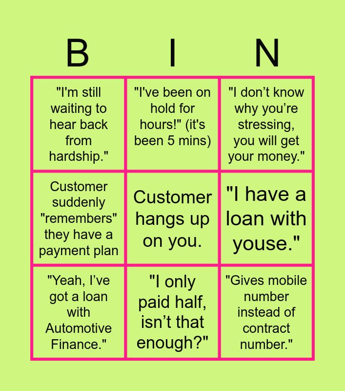 This bingo card has a free space and 8 words: "I have a loan with youse.", "I don’t know why you’re stressing, you will get your money.", "I've been on hold for hours!" (it's been 5 mins), "Yeah, I’ve got a loan with Automotive Finance.", "I'm still waiting to hear back from hardship.", "Gives mobile number instead of contract number.", Customer suddenly "remembers" they have a payment plan and "I only paid half, isn’t that enough?".