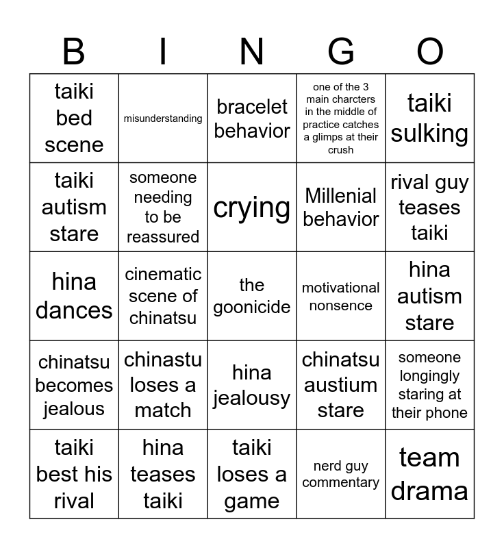 This bingo card has a free space and 24 words: chinastu loses a match, hina teases taiki, crying, taiki best his rival, taiki sulking, taiki bed scene, taiki autism stare, misunderstanding, motivational nonsence, hina jealousy, Millenial behavior, hina dances, chinatsu austium stare, someone longingly staring at their phone, someone needing to be reassured, nerd guy commentary, hina autism stare, bracelet behavior, rival guy teases taiki, cinematic scene of chinatsu, team drama, chinatsu becomes jealous, one of the 3 main charcters in the middle of practice catches a glimps at their crush and taiki loses a game.