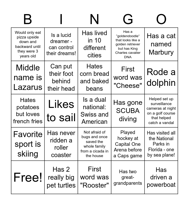 This bingo card has 27 words: Played hockey at Capital One Arena before a Caps game, Has driven a powerboat, First word was "Cheese", First word was "Rooster", Middle name is Lazarus, Has lived in 10 different cities, Is a lucid dreamer - can control their dreams!, Favorite sport is skiing, Has gone SCUBA diving, Has visited all the National Parks in Florida - one by sea plane!, Hates potatoes but loves french fries, Has a “goldendoodle” that looks like a golden retriever but has King Charles cavalier DNA, Free!, Has 2 really big pet turtles, Rode a dolphin, Has double jointed cheeks, Can put their foot behind their head, Hates corn bread and baked beans, Has never ridden a roller coaster, Would only eat pizza upside down and backward until they were 3 years old, Helped set up surveillance cameras at night on a golf course that helped catch a vandal, Has two great-grandparents, Likes to sail, Is a dual national: Swiss and American, Not afraid of bugs and once saved the whole family from a cicada in the house, Has a cat named Marbury and Once asked the pilot of her plane to refill her orange juice.