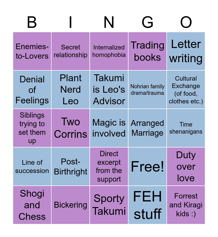 This bingo card has 25 words: Post- Birthright, Sporty Takumi, Takumi is Leo's Advisor, Shogi and Chess, Letter writing, Enemies-to-Lovers, Denial of Feelings, Secret relationship, Arranged Marriage, Direct excerpt from the support, Nohrian family drama/trauma, Siblings trying to set them up, Free!, Duty over love, Plant Nerd Leo, Forrest and Kiragi kids :), Time shenanigans, Internalized homophobia, Cultural Exchange (of food, clothes etc.), Two Corrins, Magic is involved, Bickering, Line of succession, Trading books and FEH stuff.