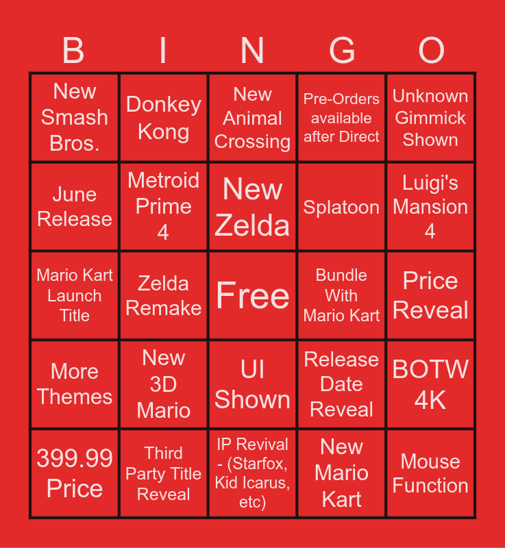 This bingo card has a free space and 24 words: New 3D Mario, Third Party Title Reveal, New Zelda, 399.99 Price, Unknown Gimmick Shown, New Smash Bros., June Release, Donkey Kong, Bundle With Mario Kart, UI Shown, Splatoon, Mario Kart Launch Title, Release Date Reveal, BOTW 4K, Metroid Prime 4, New Mario Kart, Price Reveal, New Animal Crossing, Luigi's Mansion 4, Zelda Remake, Mouse Function, More Themes, Pre-Orders available after Direct and IP Revival - (Starfox, Kid Icarus, etc).